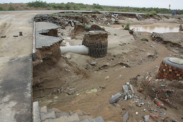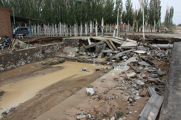 山洪来势凶猛,小镇唯一的防洪渠跨马路部分被冲毁,镇区马路多处遭到破坏。